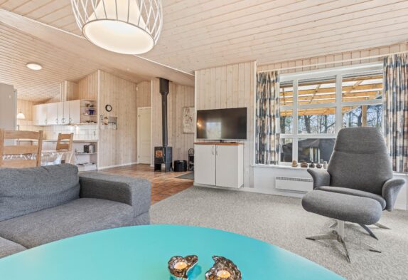 Mittelpunkt des Hauses ist der grosse Wohnraum, der zu vielen gemeinsamen Ferienstunden einlädt. Dieser gemütliche Raum, mit den grossen Panoramfenstern, ist mit einem grossen Ecksofa und bequemen Sesseln ausgestattet. An kühlen Abenden verbreitet der knisternde Kaminofen eine wohlige Wärme.
