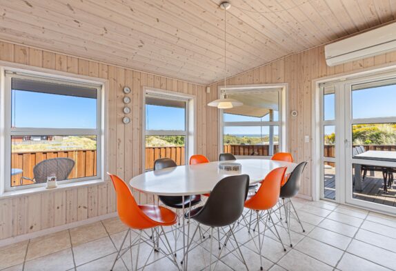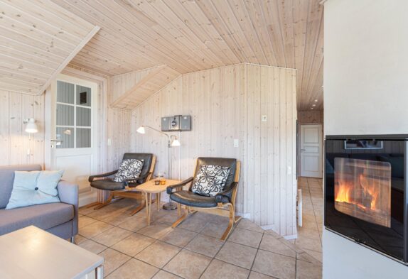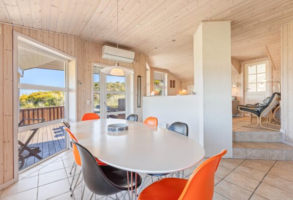Vom Wohnraum aus habt Ihr Zugang auf die grosse abgeschirmte Sonnenterrasse, die mit guten und bequemen Gartenmöbeln ausgestattet ist. Auch von hier aus habt Ihr eine wunderschöne Aussicht auf den Fjord und die umliegende Dünenlandschaft. An warmen Sommertagen könnt Ihr hier gemütliche und unvergessliche Grillabende miteinander verbringen.