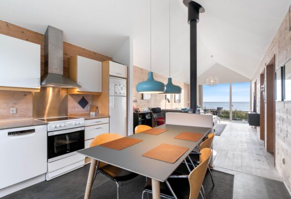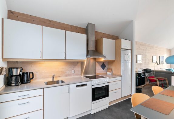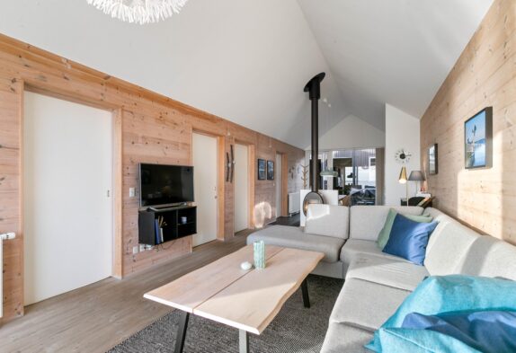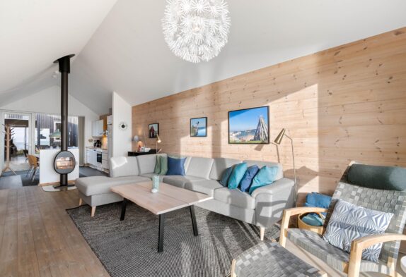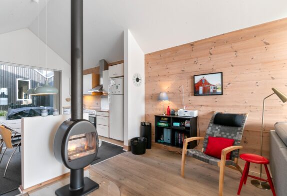 Dieses stilechte Reihenhaus hat eine schöne Lage direkt am Fjord. Die moderne und stilvolle Einrichtung sorgt für eine angenehme Atmosphäre, während der knisternde Kaminofen klassischen Charme ausstrahlt und das ganze Jahr über für eine wohlige Wärme sorgt.