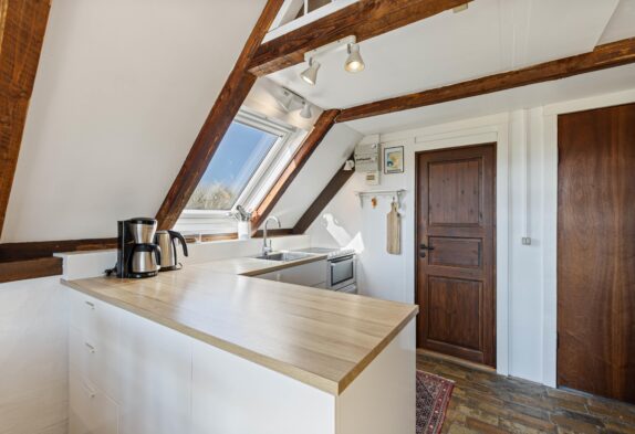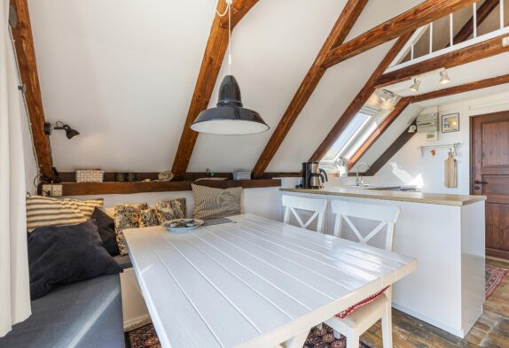 Das Herzstück des Hauses ist der kombinierte Aufenthaltsraum aus Wohnzimmer und Küche, in dem ihr nicht nur viel Platz zum gemeinsamen Kochen habt, sondern auch auf der Sofaecke euch entspannen könnt. Von hier habt ihr eine schöne Aussicht auf die Heide, wie sie sich draußen vor dem Haus im Wind hin und her bewegt. Vom Wohnzimmer aus kommt ihr auf die Überdachte Terrasse, auf der ihr euch sonnen könnt.