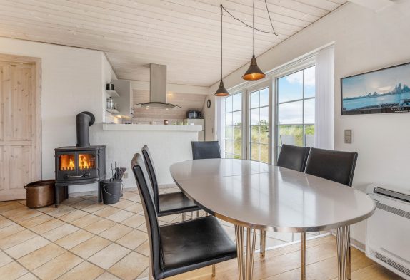 Der geräumige Wohnraum mit der integrierten Küche ist der Mittelpunkt dieses gemütlichen Reetdachhauses im klassischen Sommerhausstil. Der lichtdurchflutete Raum lädt zu vielen schönen gemeinsamen Ferienstunden ein. In der gut ausgestatteten Küche könnt Ihr leckere Ferienmahlzeiten zubereiten. Moderne Elektrogeräte, wie Spülmaschine, Trockner und Waschmaschine erleichtern die auch im Urlaub anfallenden Hausarbeiten. Um euren Geldbeutel zu schonen wurde eine energiesparende Luft-zu-Luft Wärmepumpe installiert, die im Wohnbereich für ein angenehmes und konstantes Raumklima sorgt.