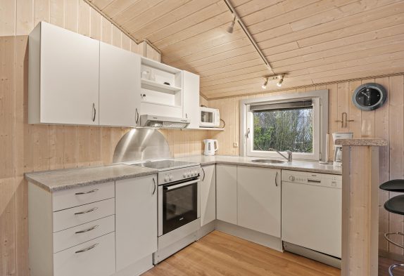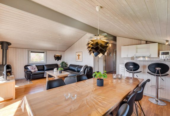 Das Herz des Ferienhauses bildet der offene Wohnbereich, in dem ein Kaminofen für eine gemütliche Atmosphäre sorgt. Diese einladende Ecke ist der perfekte Ort, um gemeinsam entspannte Abende bei einem guten Buch oder einer Tasse Tee zu genießen. Die gut ausgestattete Küche lässt keine Wünsche offen und verfügt über alle notwendigen Geräte, einschließlich einer Spülmaschine, um das Kochen zum Vergnügen zu machen. Ob beim Zubereiten von Lieblingsgerichten oder bei gemeinsamen Mahlzeiten am Esstisch – hier findet jeder seinen Platz.