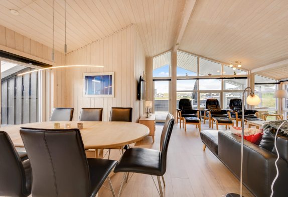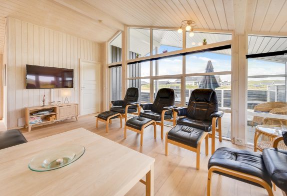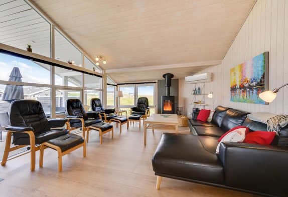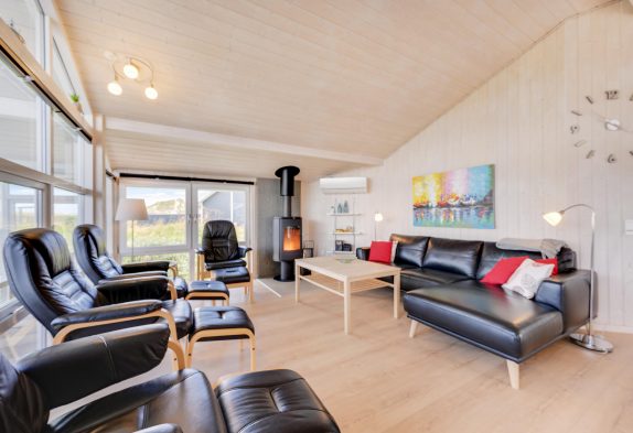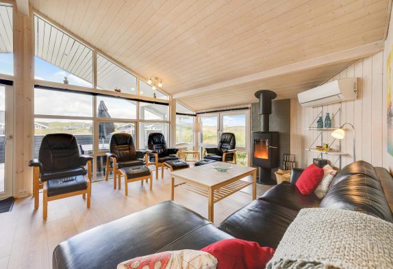 Vom Wohnzimmer aus könnt ihr die Natur und die schöne Dünenlandschaft – auch bei schlechtem Wetter, mit Feuer im Holzofen – durch die großen Fenster genießen.