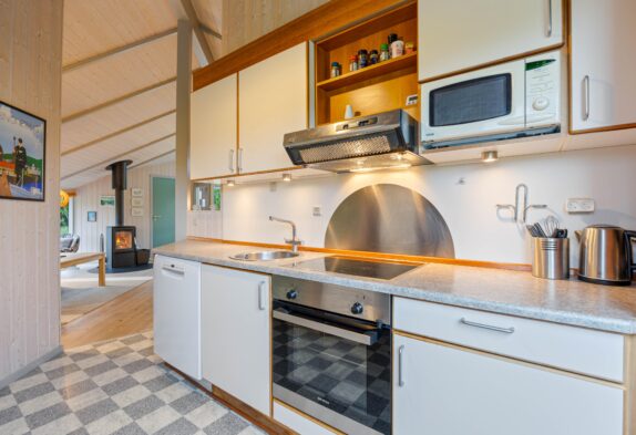 Als Herzstück kann man das große und gut geschnittene Wohnzimmer betrachten, wo sich auch der Holzofen befindet. Dieser steht fast in der Mitte des Raumes und perfekt, um auf dem Sofa die wohlige Wärme zu genießen. Durch einen Durchgang gelangt ihr in die Küche, wo ein Geschirrspüler und ein großer Kühlschrank auf euch warten.