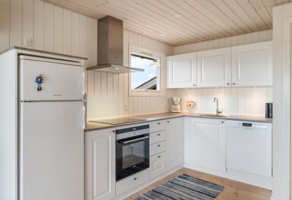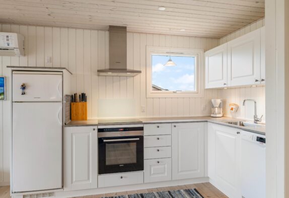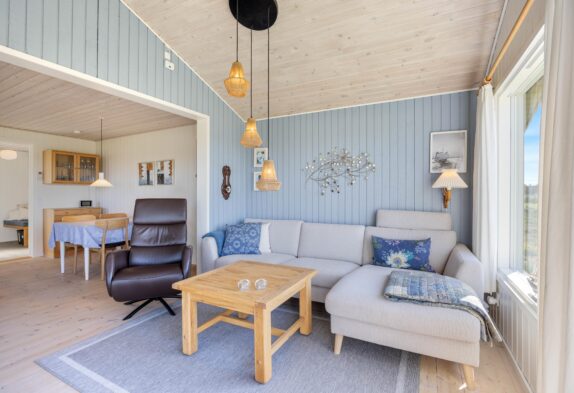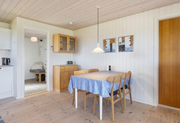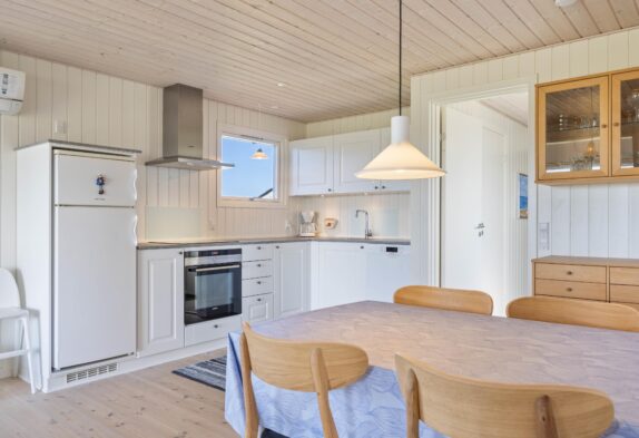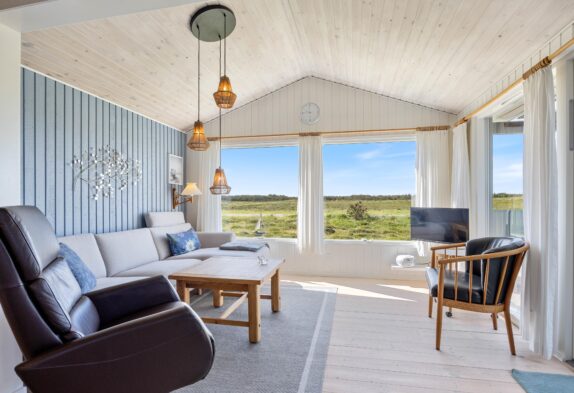 Wenn du auf der Suche nach einem Ferienhaus in Bjerregård bist, das Gemütlichkeit und Komfort vereint, wirst du hier fündig. Holzverkleidete Wände in Kombination mit den großen Fenstern und den hellen Wänden sorgen dafür, dass man sich hier richtig wohlfühlt.Der geräumige Wohnbereich lädt mit einem Kaminofen zum Entspannen ein, perfekt für gemütliche Abende nach einem Tag am Strand.