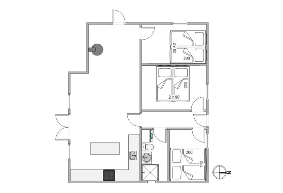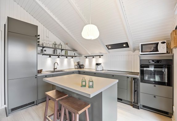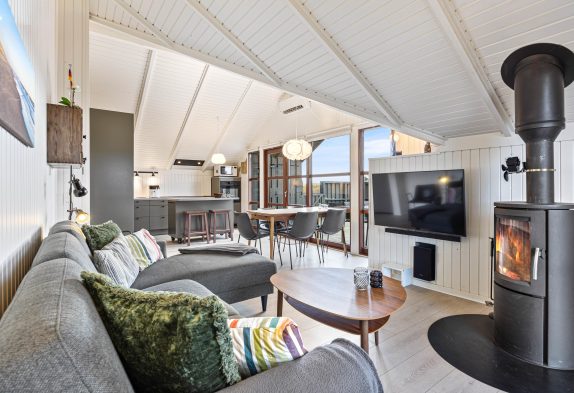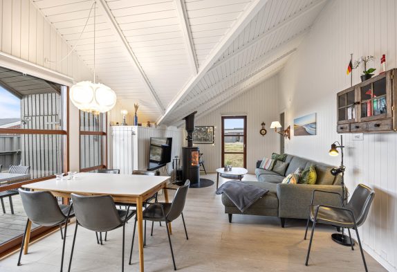 In diesem Ferienhaus wurde der Rahmen für einen perfekten Familienurlaub geschaffen. Das Wohnzimmer, das Esszimmer und die Küche sind in einen Raum integriert, wo sich alle Familienmitglieder aufhalten können – sei es als Küchenhilfe, Vorleser oder auch Organisator für die geplanten Ausflüge. Es gibt einen großen Fensterbereich, der zusammen mit der Terrassentür viel Licht von Aussen hereinbittet.