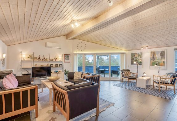 Der Wohnbereich dient als Herzstück des Hauses und kombiniert das Wohnzimmer mit der gut ausgestatteten Küche. Hier werdet ihr garantiert viele gemütliche und familiäre Momente in den Ferien verbringen, in denen ihr euch wunderbar unterhalten könnt. In der Mitte des Raumes befindet sich der Holzofen, der das ganze Jahr über Wärme und wohlige Atmosphäre sorgt.