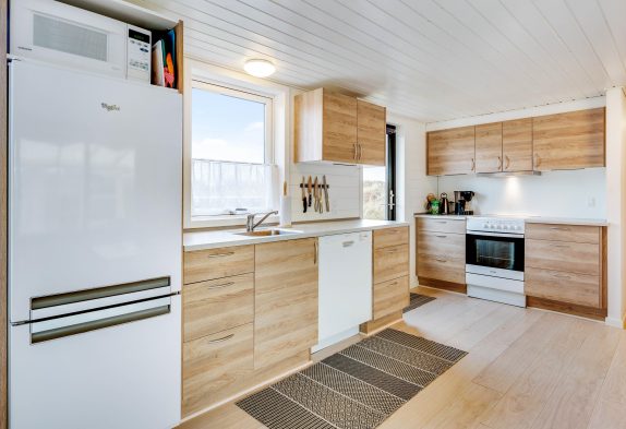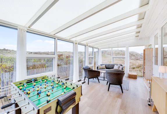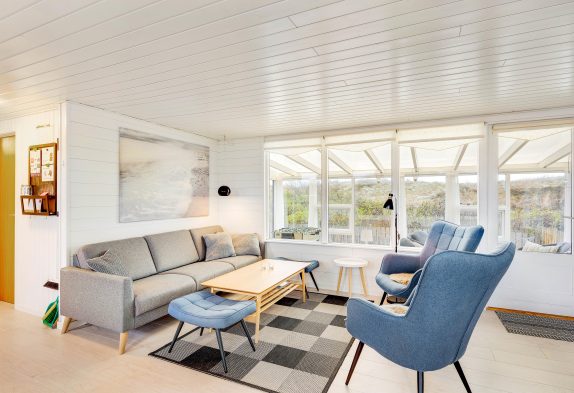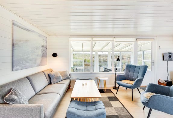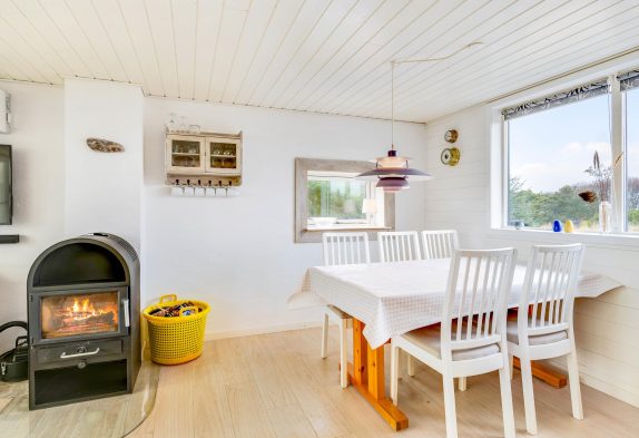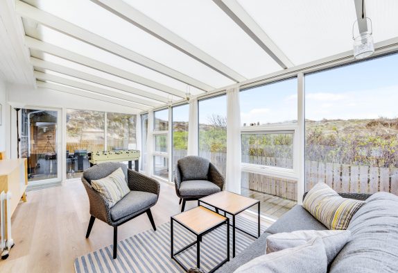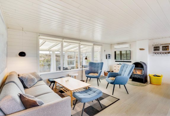 Im Wohnbereich könnt ihr an kühlen Tagen dem knisternden Kaminofen belauschen und bei einem guten Buch eine Tasse Tee genießen oder ihr lehnt euch im Sessel zurück und schaut euch gemeinsam eure Lieblingssendung an. Die geschlossene Veranda bietet einen schönen Ausblick in die Natur und direkten Zugang zur geschlossenen Terrasse. Hier könnt ihr die Kinder und euren Hund sicher spielen lassen und am Abend den Grill anheizen und den güldenen Schein des Sonnuntergangs beobachten. Die aufgehende Sonne über den Ringkøbing Fjord könnt ihr beim Morgenkaffe auf der zweiten Terrasse beim Hauseingang beobachten.
