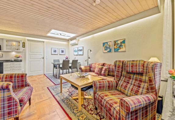Ringsum das Haus findet ihr viele verschieden Sitzmöglichkeiten – vom Morgenkaffee auf der Ostterrasse bis zum Sonnenbad auf der Süd- und Westterrasse – hier ist so viel Platz für entspannende Momente. Euch stehen sogar insgesamt zwei Wohnzimmer zur Verfügung. Während Fussballbegeisterte das entscheidende Turnier schauen, unterhalten sich alle Anderen im Wohnzimmer im Wintergarten.