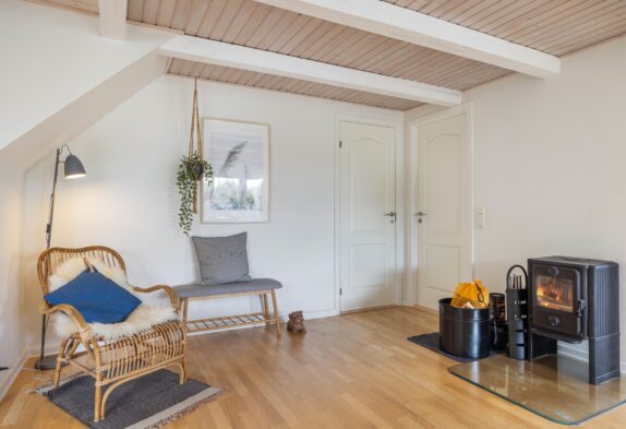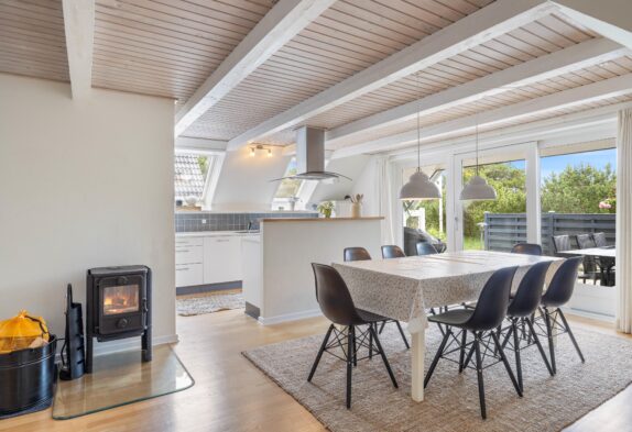 Die gute Ausstattung des Ferienhauses ermöglicht es euch einen entspannten Urlaub zu verbringen. Die Küche ist mit einer Spülmaschine ausgestattet, damit ihr genügende Zeit für Urlaubserlebnisse habt. Der Wohnbereich ist einladend und bietet ausreichend Platz, um mit der Familie oder Freunden schöne Abende zu verbringen, während im Hintergrund das Prasseln des Feuers im Holzofen zu hören ist.