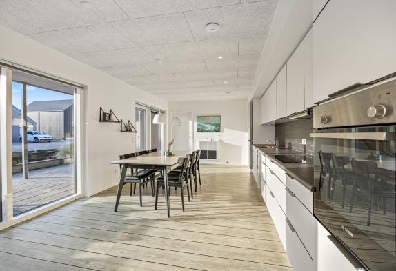 Durch den Flur hindurch kommt ihr zu dem hellen Wohn- und Essbereich mit offener Küche an dem sich die breite Terrasse anschließt. Im Wohnzimmer könnt ihr es euch nach einem langen Spaziergang am Fjord auf dem Sofa vor dem Flachbildfernseher bequem machen und die Fußbodenheizung sorgt für eine Wohlfühltemperatur. Bitte beachtet, dass die Auswahl an deutschen Fernsehprogrammen beschränkt ist.