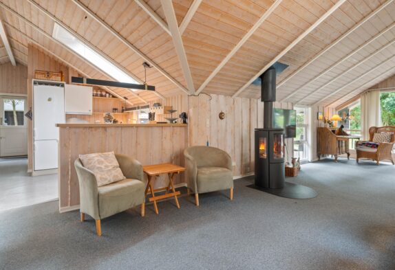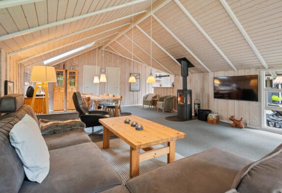 Das Wohnzimmer bildet zusammen mit dem Essbereich und der offenen Küche den zentralen Raum im Ferienhaus. Hier könnt ihr euch zu entspannten Abenden auf dem Sofa oder spannenden Spieleabenden am Esstisch vor dem wärmenden Kaminofen treffen. Außerdem gibt es hier viel Platz für die mitgebrachten Spielzeuge. In der Küche, die umfangreich mit allen Utensilien und mit einer Spülmaschine ausgestattet ist, kannst du dich so richtig austoben.