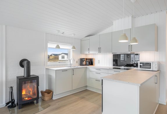 Die Küche und der Essbereich sind in einem großen Wohnraum zusammengefasst, in dem ihr euch gemütlich unterhalten und Spiele spielen könnt und gleichzeitig etwas Leckeres zu Essen zubereiten könnt. Am Abend oder an kühleren Tagen sorgt der Holzofen für kuschelige Wärme und zusätzliche Urlaubsstimmung. Alternativ steht euch auch eine modernen Wärmepumpe zur Verfügung, um für angenehme Temperaturen zu sorgen.