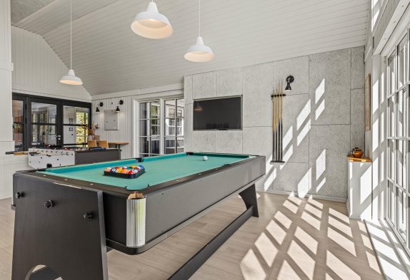 Ein direkter Übergang führt zum großzügig eingerichteten Wohnzimmer. An kühleren Tagen könnt ihr es euch hier vor dem Kamin mit einem spannenden Buch gemütlich machen oder ihr nutzt den Aktivitätsraum, welcher zum Billardspiel, Tischtennis, Airhockey oder Kicker Match einlädt.
