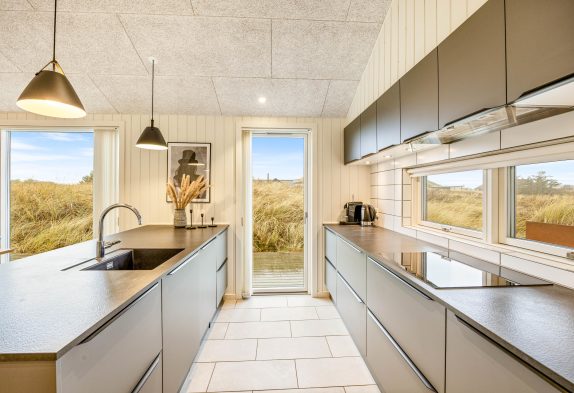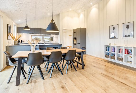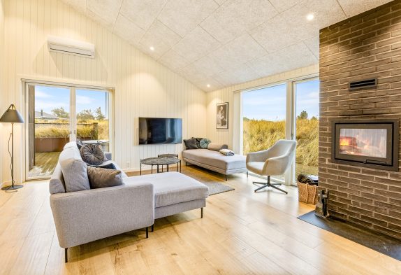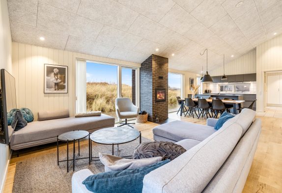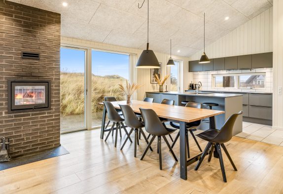 Das große Wohnzimmer wurde mit der offenen Küche kombiniert. In der Mitte vor der großen Fensterfront und den Terrassentüren steht der Kaminofen, der das ganze Jahr hindurch für eine warme und angenehme Urlaubs-Atmosphäre sorgt. Am Esstisch lassen sich wunderbar lange Spieleabende veranstalten, nachdem du mit deiner Familie oder deinen Freunden in der großen Küche gekocht hast.