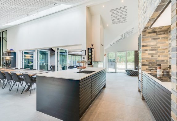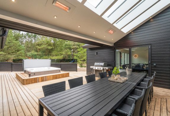 Auch der Außenbereich des 5-Sterne-Ferienhauses wird euch nicht enttäuschen. Auf einer riesigen Fläche steht das Ferienhaus und bietet euch mehrere Terrassen, die teilweise überdacht sind. So findet ihr je nach Wetter immer ein angenehmes Plätzen in der Sonne oder unter dem Vordach, um weiterhin die frische Seeluft genießen zu können.