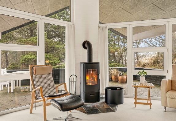 Helles Interieur mit großen Fenstern und Kaminofen