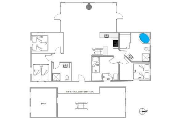 Die beiden Badezimmer, welche jeweils über eine Fußbodenheizung verfügen, sowie die 4 Schlafzimmer befinden sich im Erdgeschoss des Ferienhauses. Hier findet ihr also ausreichend Platz für die große Familie oder aber für einen Urlaub mit euren Freunden. Der offene Wohn- und Essbereich mit der hellen und offenen Küche bildet das Zentrum dieses gemütlichen Hauses.