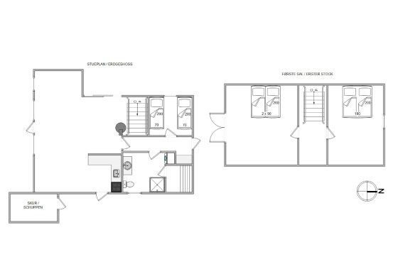 Das Ferienhaus kommt mit einer guten Raumaufteilung daher. Zwei der drei Schlafzimmer liegen in der 1. Etage und ein Schlafzimmer sowie Wohnzimmer, Küche mit Essbereich und das Badezimmer liegen im Erdgeschoss des Hauses.