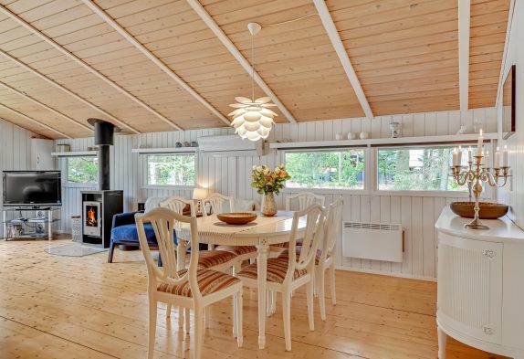 Das helle mit viel Holz und tollen Möbeln versehene Wohnzimmer lädt geradezu ein, es sich auf dem großen Sofa bequem zu machen. Wenn dann am Abend noch ein Feuerchen im Kaminofen brennt, kann es kaum gemütlicher werden. In der hellen Küche findet ihr alles, was ihr braucht, um etwas Leckeres zuzubereiten und auch der Essbereich ist super gemütlich.