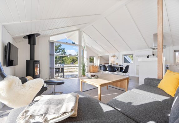 Das Zentrum des Hauses ist der schöne Wohnbereich, hier wurde vorrangig Holz verarbeitet und strahlt durch die helle Wand- und Deckenfarbe in weiß viel Wärme, Ruhe und Gemütlichkeit aus. Zur Unterhaltung an Regentagen stehen euch der Fernseher mit DVD-Player und gratis Internet zur Verfügung. Wer es lieber analog mag, kann sich mit einem Buch in die Kuschelecke zurückziehen, während im Kaminofen das Brennholz knistert.