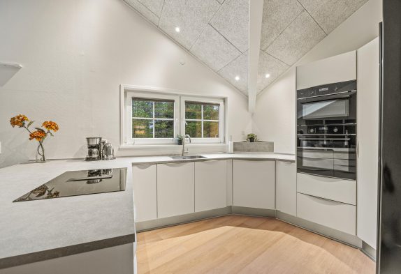 Unter der 2022 Renovierung wurde im Haus durchlaufender Holzboden gelegt, und so verfügt das Haus jetzt über Fußbodenheizung im ganzen Haus. Im grossen Wohnbereich wurden auch neue Troldtektdecken installiert.