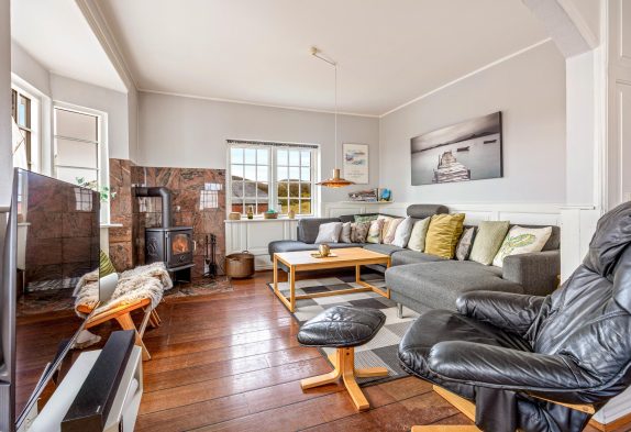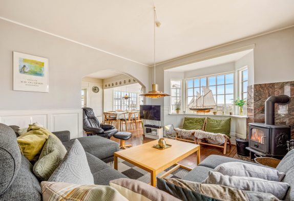 Der große Wohnbereich bietet nicht nur viel Raum und Helligkeit, sondern hat auch eine etwas maritime und dabei gemütliche Ausstrahlung. Die Küche ist offen in den Raum integriert und der gemütliche Essbereich liegt direkt an einer großen Fensterfront, sodass ihr einen tollen Blick nach Draußen habt.