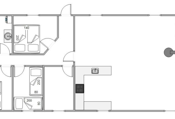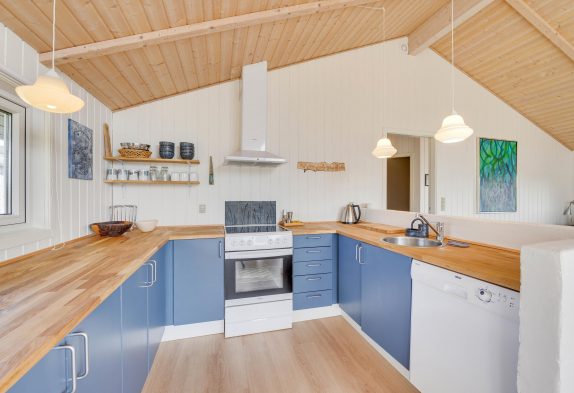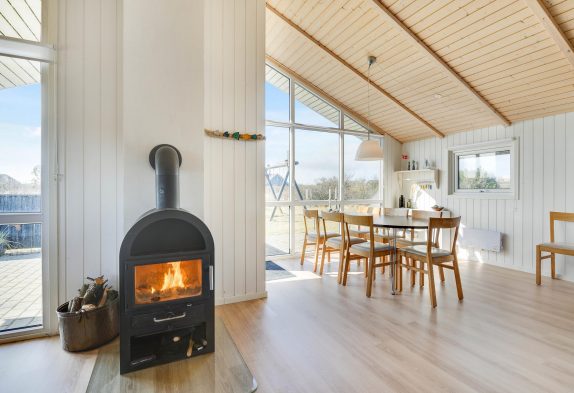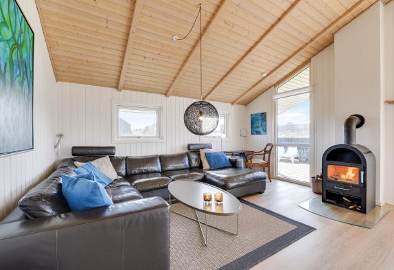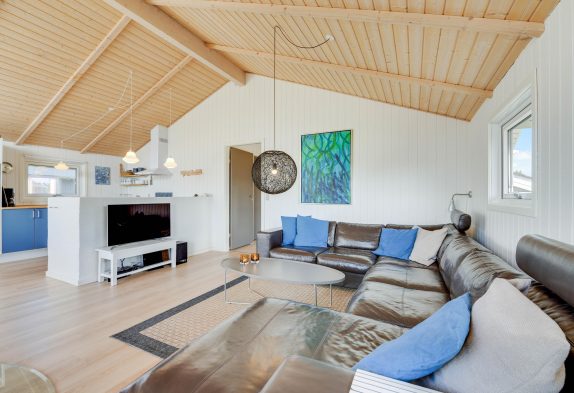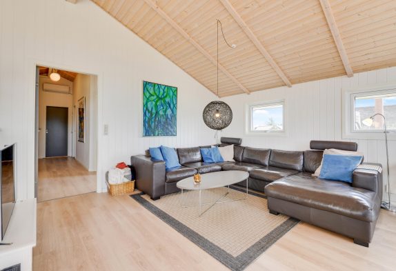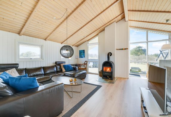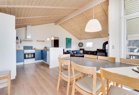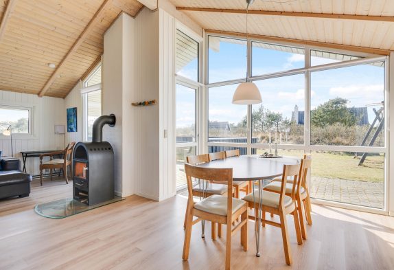 Das Ferienhaus auf Fyrmarken 195 liegt fast ganz am Ende des Weges und strahlt Ruhe und Gemütlichkeit aus. Das Wohnzimmer ist offen mit der Küche kombiniert und beherbergt darüber hinaus einen Essbereich, von dem aus ihr durch die hohen Fenster ins Grüne schaut.