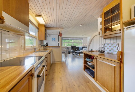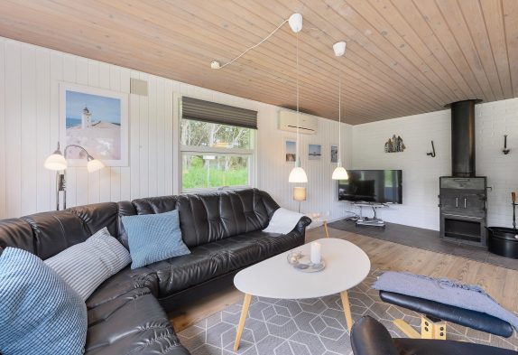 Das Wohnzimmer lädt zu gemütlichen Fernsehabenden vor dem Kaminofen ein, macht es euch auf dem Sofa oder im Fernsehsessel bequem und schaut eure Lieblingsserie, wenn draußen der Westwind weht. Die maritimen Details und die typisch skandinavische Holzverkleidung an Decken, Wänden und Böden gibt dem Raum seinen ganz besonderen Charme.