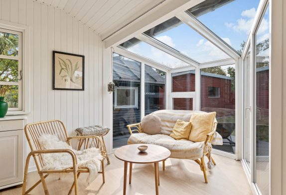 Eine kleine Sitzgruppe im hellen Wintergarten lädt zu einer Lesestunde in einem spannenden Buch oder zu einer Runde Kartenspielen ein. Macht es euch einfach gemütlich und genießt den Blick nach Draußen.