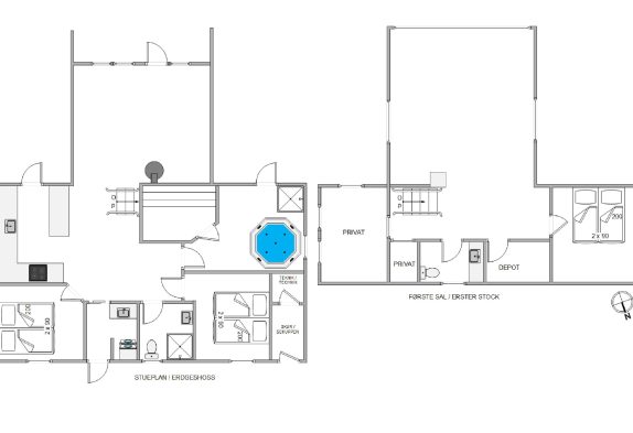 Insgesamt stehen euch 3 Schlafzimmer, jeweils mit Doppelbett, 2 Badezimmer sowie ein Gäste-WC im Obergeschoss und ein Wohnzimmer mit integrierter Küche zur Verfügung. Darüber hinaus gibt es eine Sauna sowie einen Standwasserwhirlpool. Ein weiteres Wohnzimmer mit herrlicher Panoramaaussicht liegt in der 1. Etage.