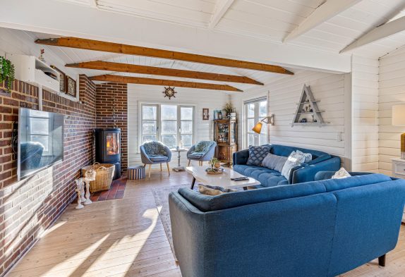 Das offen mit der Küche kombinierte Wohnzimmer hält auch einen Kamin bereit, wo ihr es euch gerade am Abend so richtig gemütlich machen könnt. Vielleicht habt ihr den Tag am Strand oder bei ausgiebigen Spaziergängen durch das Dünengebiet verbracht und nun legt ihr einfach die Beine hoch und entspannt bei einem Gläschen Wein.