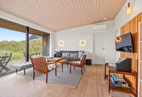 Ihr mögt das Besondere und seid offen für eine moderne und eher untraditionelle Bauweise und Einrichtung? Dann schaut euch unbedingt einmal dieses in 2014 neu errichtete Ferienhaus mit Lage auf Tyttebærvej 1B in Vejers an. Eine moderne Fassade mit vielen und teilweise auch sehr großen Fensterbereichen lassen viel Licht in das Haus und ihr habt immer die Möglichkeit, nach Draußen zu schauen. Platz gibt es für bis zu 6 Personen und eine Sauna steht euch für entspannende Momente bereit.