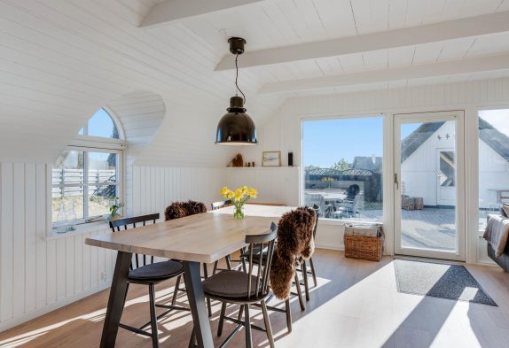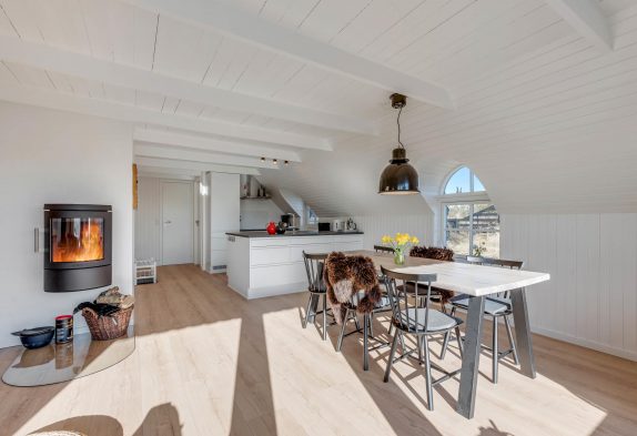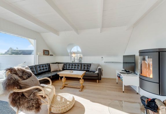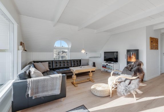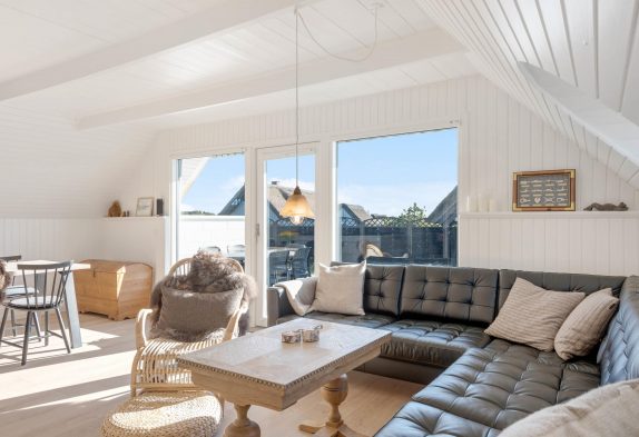 Der Wohnbereich liegt ebenfalls in offener Verbindung zu Küche und Essbereich, so dass ihr viel Zeit gemeinsam mit der Familie verbringen könnt. Die hellen Böden in Kombination mit den weißen Wänden und Decken, die sich durch das gesamte Ferienhaus ziehen, bilden den Rahmen für viel Gemütlichkeit und Entspannung.