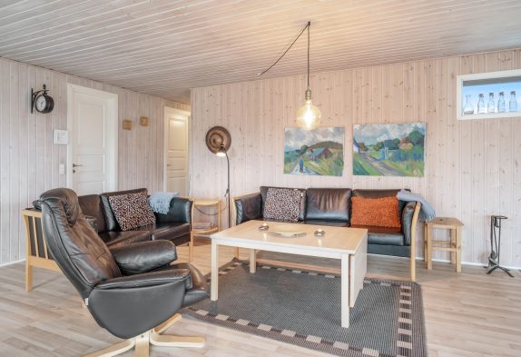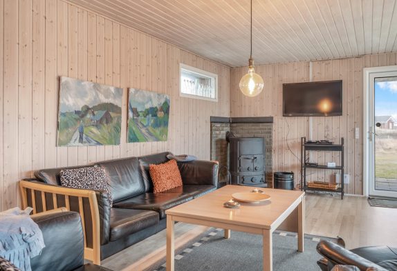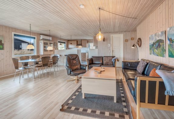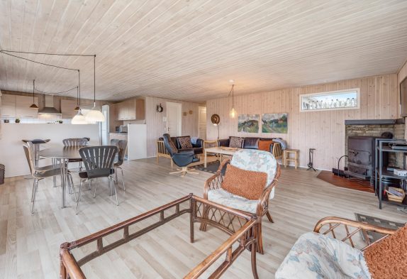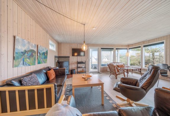 Das schöne Ferienhaus in Houvig hat alles, was ein Ferienhaus ausmacht: eine gemütliche Einrichtung, gute Atmosphäre, einen knisternden Holzofen, gute Möbel und eine schöne Aussicht. Die hellen Holzwände, Decken und Fenster tragen dazu bei, dass das Ferienhaus geräumig und einladend wirkt.