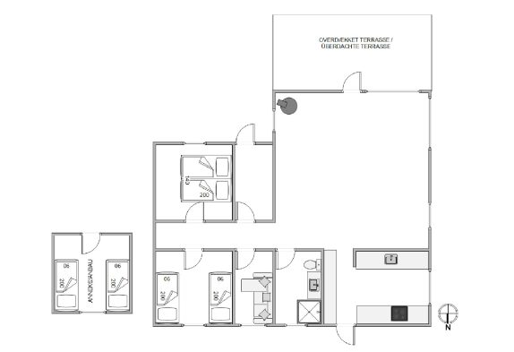 Das Ferienhaus verfügt über 6 Betten, verteilt auf 3 Schlafzimmer, von denen eines sich im schönen Nebengebäude auf dem Grundstück befindet. Außerdem gibt es ein kleineres Zimmer, das mit einem Schlafsofa ausgestattet ist. Das Badezimmer ist schön und hell, mit Dusche und Fußbodenheizung.