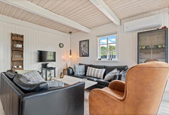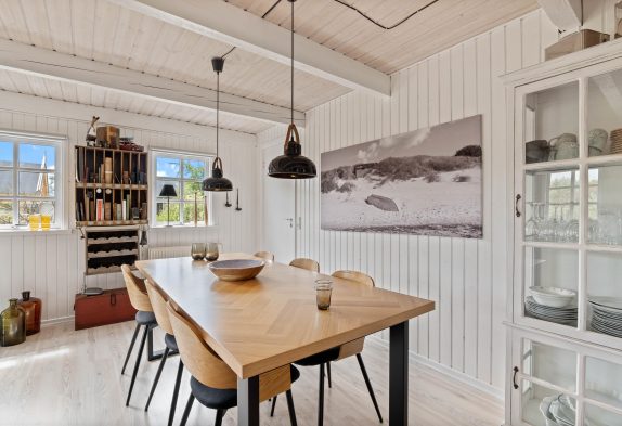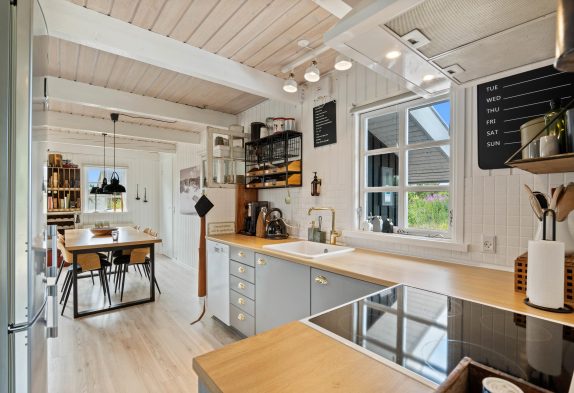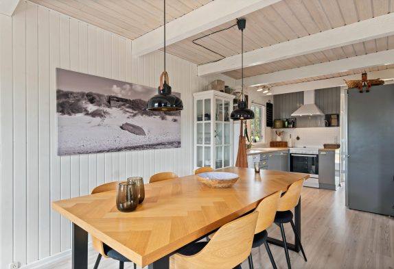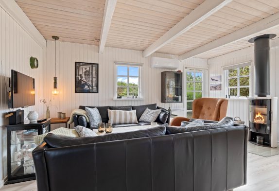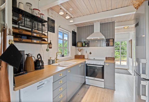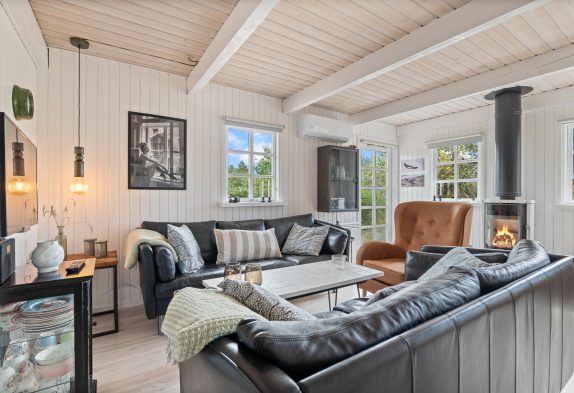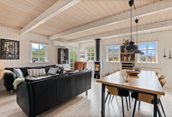Das zuletzt in 2022 liebevoll renovierte Sommerhaus ist hell und mit vielen schönen Details sowie einer geschmackvollen Möblierung ausgestattet. Die kombinierte Wohnküche bietet einen schönen Lichteinfall mit ihren großen Fenstern nach Süden. Sowohl vom Esstisch und als auch vom Sofa habt ihr Blick auf den knisternden Kamin und die wunderschöne Natur, die das Haus umgibt.
