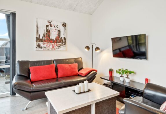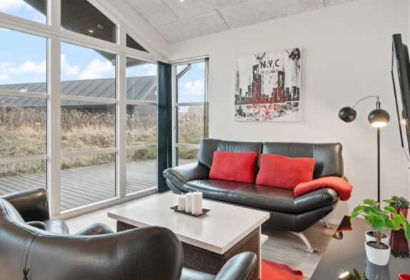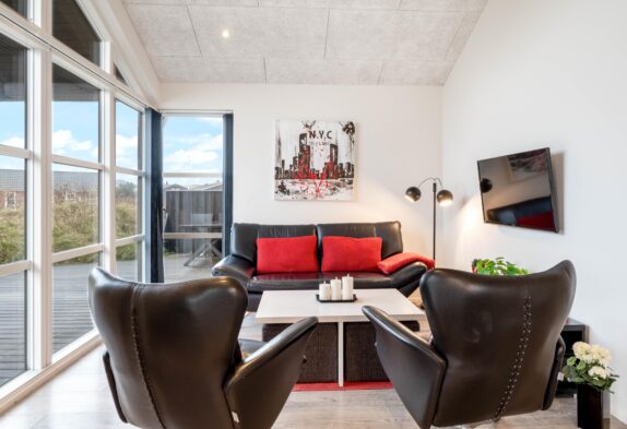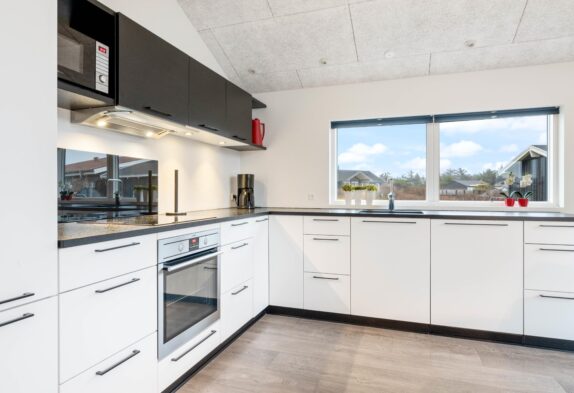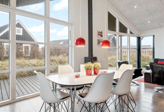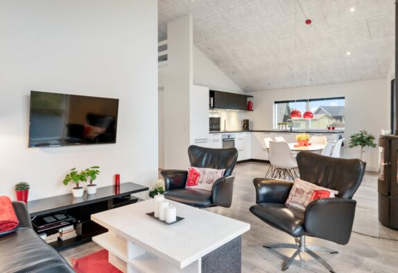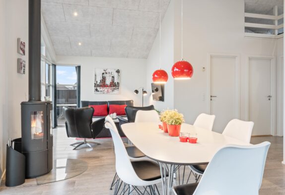 Ihr werdet euch durch die gemütliche Atmosphäre des Ferienhauses sofort zu Hause fühlen. Die helle Inneneinrichtung mit modernen und komfortablen Möbeln wird durch das fantastische Licht der großen Fenster ergänzt. Das Wohnzimmer, das zur Küche hin offen ist, ist der ideale Ort für gemütliche Urlaubsmomente. Ob ihr euch einen Film anschaut, ein lustiges Spiel spielt oder gemeinsam kochen möchtet, hier könnt ihr das alles machen. Eine energiesparende Luft-zu-Luft Wärmepumpe sorgt für angenehme Temperaturen, und wenn ihr es noch wärmer und gemütlicher haben wollt, könnt ihr den Holzofen im Wohnzimmer anheizen.
