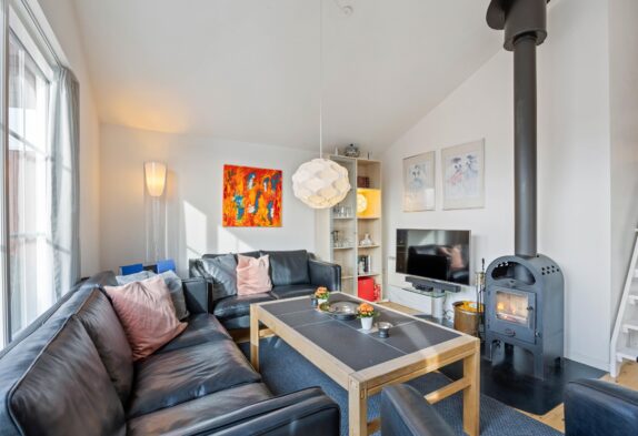 Der Wohnbereich ist mit modernen, gemütlichen Möbeln, einem Kaminofen, SmartTV und einer energiesparenden Wärmepumpe ausgestattet. Aus dem Wohnzimmer heraus habt ihr auch einen direkten Zugang zu der schönen, nach Süden ausgerichteten Terrasse.