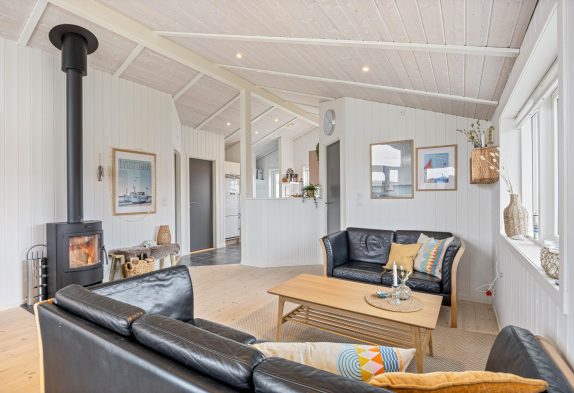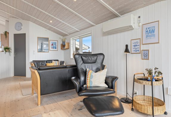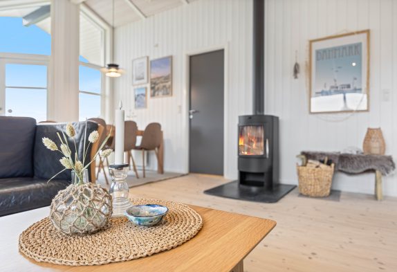 Das Wohnzimmer ist geschmackvoll eingerichtet und verfügt eine energiesparende Wärmepumpe, welche nach Bedarf für Wohlfühltemperatur sorgt. Im Wohnbereich mit direktem Zugang zur Terrasse gibt es außerdem einen gemütlichen Alkoven, in dem man nach einem langen Strandspaziergang ganz wunderbar entspannen kann. Das Knistern des Feuers im Kamin sorgt zusätzlich für Wohlfühlmomente.