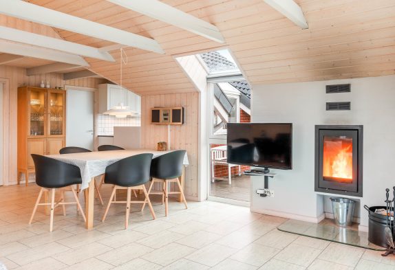 Der natürliche Mittelpunkt des Ferienhauses ist das gemütliche Wohnzimmer, das Küche, Essbereich und Wohnzimmer vereint. Der Wohnbereich verfügt über einen Flachbildfernseher mit Anschlussmöglichkeit für die eigene Spielkonsole, SAT-Receiver, DVD-Player, Radio und CD sowie eine energiesparende Wärmepumpe, während die Küche u.a. mit Geschirrspüler, Kühlschrank mit 85 Liter Gefrierfach und Mikrowelle gut ausgestattet ist.