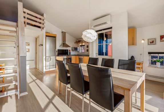 Im Wohnbereich, wo Küche und Wohnzimmer miteinander vereint sind, könnt ihr viele gemeinsame Stunden verbringen. Rund um den Esstisch finden alle Familienmitglieder für gemeinsame Mahlzeiten Platz. Anschließend könnt ihr es euch auf den bequemen Sofas vor dem Fernseher gemütlich machen und gemeinsam einen guten Film anschauen. Der Kamin sorgt für die richtige Urlaubsatmosphäre und der Schlafboden im Wohnzimmer sorgt für eine gute Rückzugsmöglichkeit – dieser wird bestimmt das Highlight bei den jüngsten Urlaubern sein.