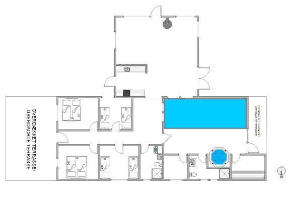 Auf der Holzterrasse, welche einmal komplett um das Ferienhaus herum geht und teilweise überdacht ist, findet ihr ausreichend Platz, um gemeinsam zusammenzusitzen, eine schmackhafte Mahlzeit vom Grill zu genießen oder euch nach einem Bad im Pool auf den Loungemöbeln zu entspannen.