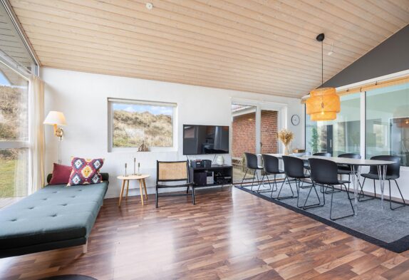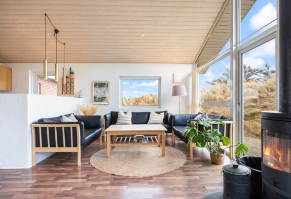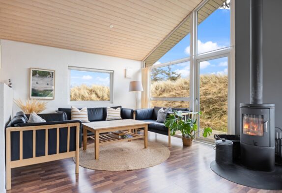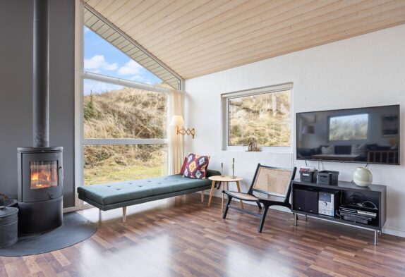 Der Wohnbereich ist offen gestaltet und durch die großen Fenster kommt viel natürliches Tageslicht in das Ferienhaus hinein. Neben dem Kamin steht ein Tagesbett für euch bereit – macht es euch hier z.B mit einem Buch in der Hand gemütlich, lauscht dem Knistern des Kamins und genießt die Aussicht.
