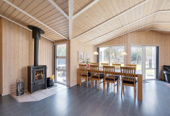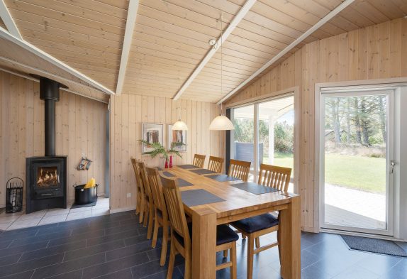 Der Küchenbereich liegt in offener Verbindung zum großen Wohnzimmer, sodass ihr alle gemeinsam entspannen oder auch leckere Mahlzeiten zubereiten und anschließend genüsslich verspeisen könnt. Ein Kamin sorgt gerade an kühleren Tagen oder Abenden für die perfekte Urlaubshygge mit einem knisternden Feuer im Hintergrund.