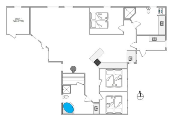 Insgesamt gibt es 3 Schlafzimmer mit je einem Doppelbett (160×200). Des Weiteren gibt es 2 Badezimmer, welche über eine Fußbodenheizung verfügen – kalte Füße sind hier also keine Option. Eines der zwei Badezimmer beinhaltet die Sauna und einen Whirlpool, wo ihr eine verdiente Auszeit vom Alltag nehmen könnt. Auch eine Waschmaschine und ein Trockner sind vorhanden, was gerade für Familien mit Kindern oder auch für Langzeiturlauber sehr komfortabel ist.