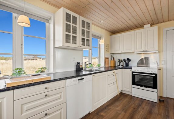 Die helle, moderne Küche lädt zum gemeinsamen Kochen ein, die von Dünen umgebene Terrasse zum Genießen des Morgenkaffees, der spektakulären Sonnenuntergänge oder ganz einfach das Dasein an sich.
