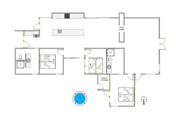 Das Ferienhaus hat 3 Schlafzimmer mit insgesamt 6 Schlafplätzen und außerdem 2 Bäder, wo wie in allen Räumen Fußbodenheizung installiert ist. Die Küche ist mit allem modernen Inventar eingerichtet, und Waschmaschine und Trockner gehören natürlich auch zur Ausstattung des Ferienhauses.