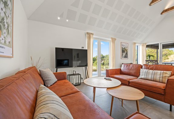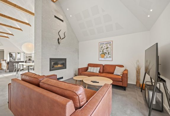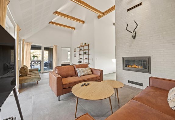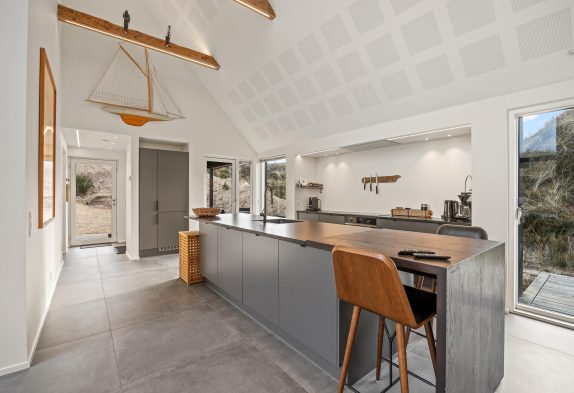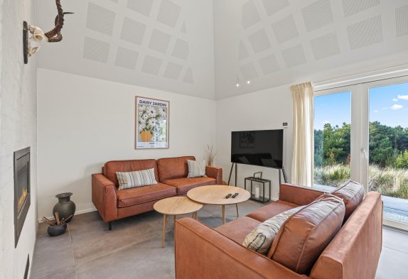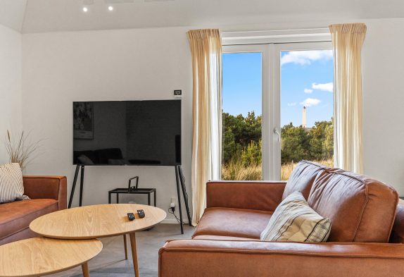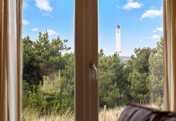 Der große Ess- und Wohnbereich ist durch eine Wand mit einem integrierten Tunnelkamin teilweise abgeteilt, welcher schon beim Abendessen für Gemütlichkeit sorgt. Die Atmosphäre des lichtdurchfluteten Hauses mit der herrlichen Aussicht auf die umliegende Dünenlandschaft und den Leuchtturm von Blåvandshuk ist einmalig. Hier könnt ihr unvergessliche Ferien verbringen.