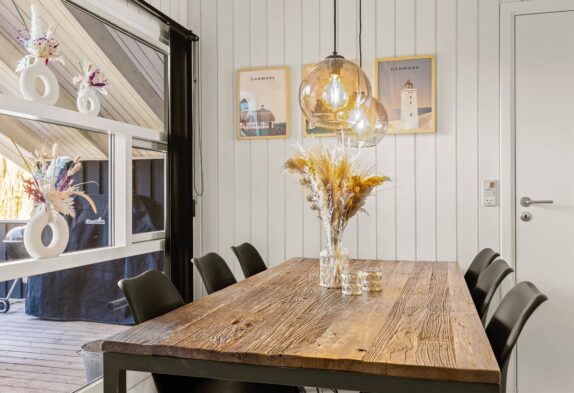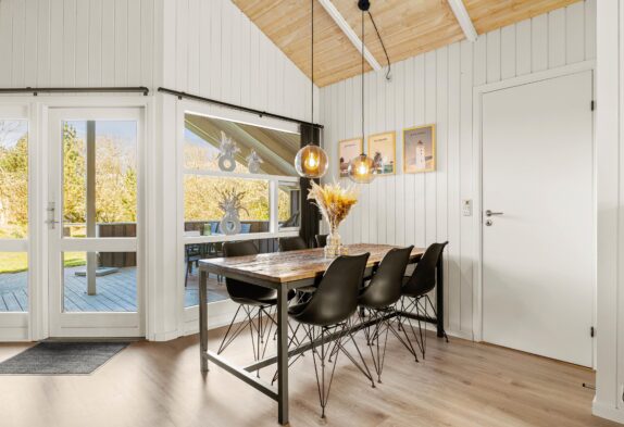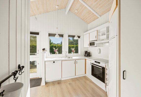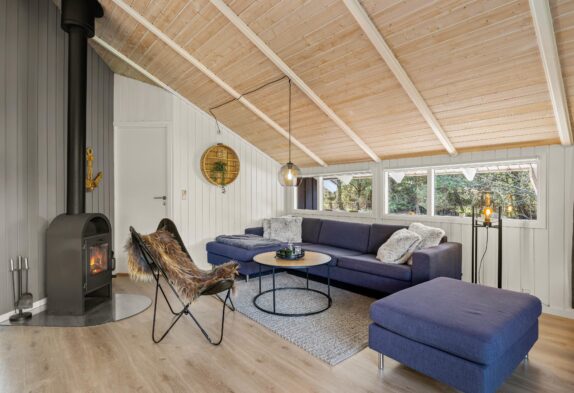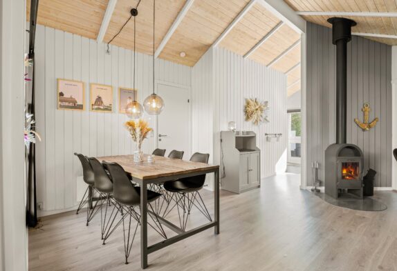 Der Wohnbereich des Ferienhauses im Blomstervangen 72 ist ein gemütlicher Rückzugsort der mit einem Kaminofen ausgestattet ist, der an kühleren Tagen für wohlige Wärme sorgt. Die Küche ist modern ausgestattet und bietet alles was ihr für eine komfortable Selbstversorgung benötigt. Eine Spülmaschine erleichtert euch dabei den Abwasch. Die angrenzende Essecke bietet ausreichend Platz für gemeinsame Mahlzeiten und gesellige Abende mit Familie und Freunden.